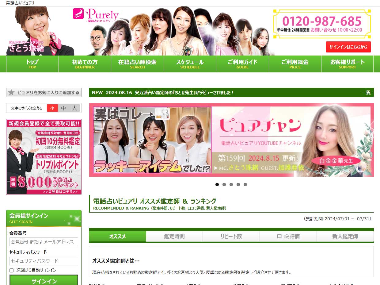 電話占いピュアリは、業界随一のメディア露出と人気を誇り、タレントや芸能人も御用達の一流占い師が多数在籍する大手電話占いサービスです。
