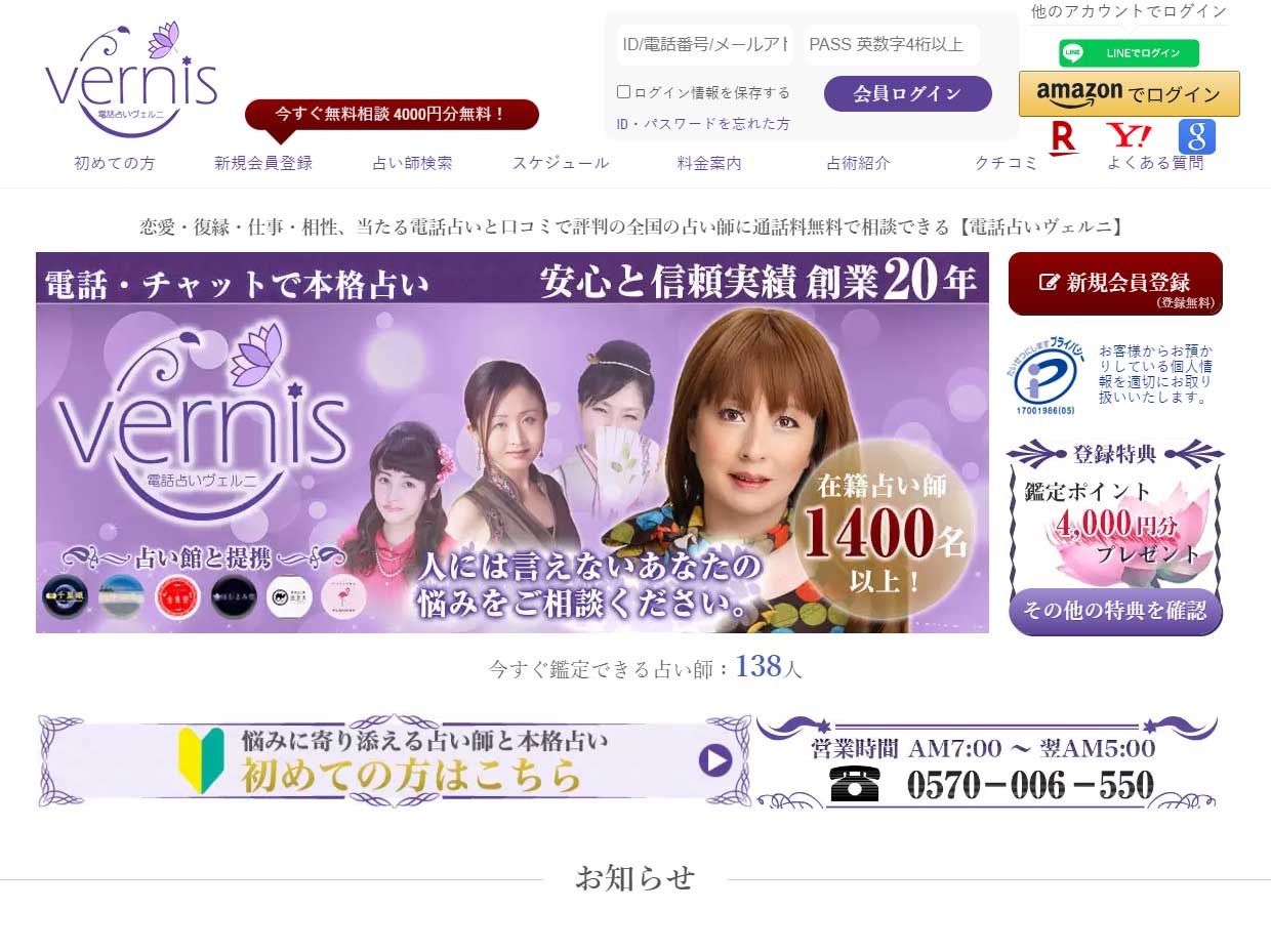 恋愛から結婚・復縁・人間関係や仕事といった幅広いジャンルに対応しており、N.T.S公認タロットマスターの伝説の占い師と呼ばれる美愛(びあん)先生を始め、実力派の占い師が多くクチコミで当たると評判です。